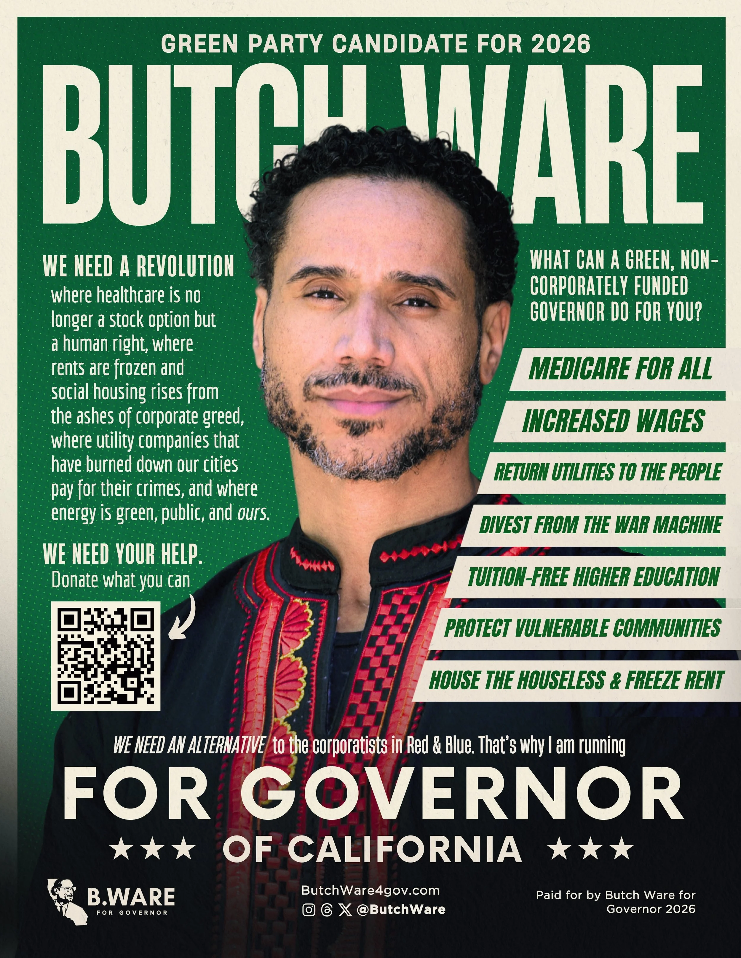 Healthcare is a human right and should be accessible to all residents of California without regard to income or zip code. With the third highest GDP in the world, California has more than enough resources to make universal healthcare a reality. We will cut out the parasitic middleman of private health insurance and use those funds which are currently going to shareholder portfolios and CEO salaries for actual healthcare. The Butch Ware campaign unequivocally supports a state based single payer healthcare system through the CalCare program. The principles of CalCare are simple: